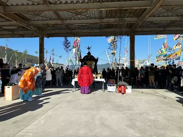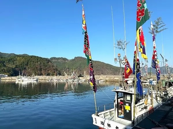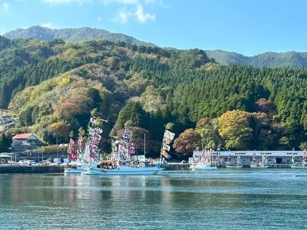 大漁旗を掲げた漁船が終結した曳舟まつり