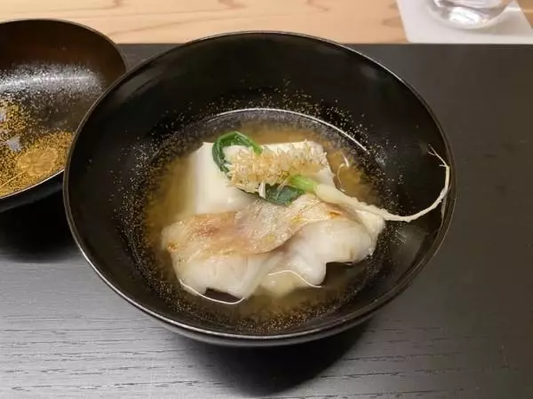 今回監修をつとめた【徳山鮓】のスペシャリテともいえる『鮒鮓』は、熊のコンソメをあしらったジュレと合わせていただきます。元来、滋賀県の郷土料理として有名ではあるものの、そのクセの強さから食べる人を選ぶこの料理、徳山氏が長年かけて改良し、食べやすいように洗練させてきた味が銀座の地で味わえることに感動を禁じ得ません。野性味あふれる熊のコンソメがまた負けない存在感。私自身、滋賀県に在住歴もあり『鮒鮓』が好物でもありますが、これは苦手意識のある人にも絶対食べて欲しいと思った逸品です。