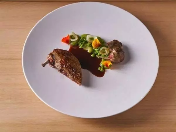 鳩は蜂蜜と醤油を刷毛で塗りながら、1週間以上冷蔵庫で寝かせます。油をかけながら皮目をパリッとさせ、オーブンで焼き上げます。付け合わせにはグリーンピースとそ空豆、ビーツと鳩のコンソメのソースを添えて。