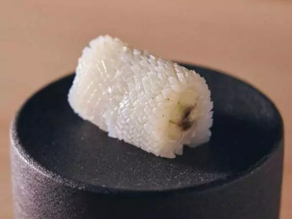 細かく包丁目を入れて内側の甘みを引き出した明石のスミイカに、みずみずしく、青臭くないところが気に入っているという「NOTO 高農園」の生の加賀太きゅうりと黒ニンニクのペーストを入れて巻いたアミューズ。