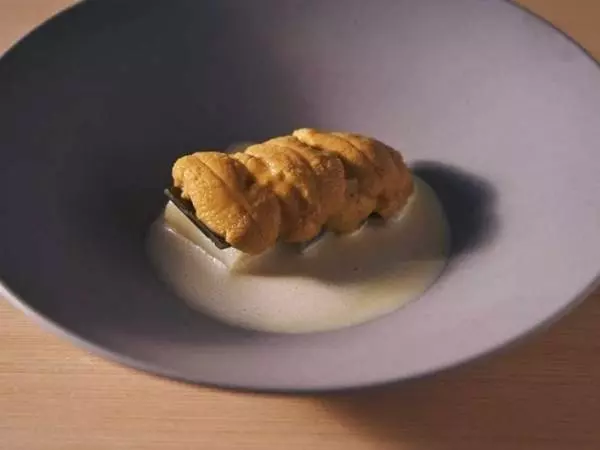 フランス産のホワイトアスパラガスは、その皮と昆布だしで火を入れ、食感を活かします。昆布、自家製のゆずの塩漬け、紫ウニをのせ、アスパラガスのゆで汁を煮詰めてヴァンジョーヌを加えたソースでいただきます。