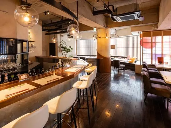 店内はインテリアに和傘が使われるなど、和と洋のテイストをうまく調和させた落ち着ける空間。キッチンはハーフオープンスタイルで、カウンター席からはシェフが腕を振るう様子を間近に見ることもできます。ゆったりとした時間が過ごせるようにデザインされ、大人の新年会にふさわしい一軒です。