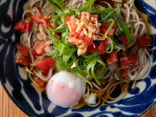 好みで卵黄を混ぜながらいただく『牛肉と九条葱のぶっかけそば』
