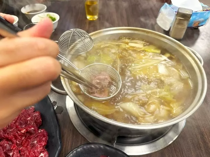 テーブルにつくとほどなく鍋と肉が運ばれて来て、鍋にだしが注がれます。鍋の中には白菜が入っています。肉はその日の仕入れで変わるようですが、これを網状のおたまのなかでしゃぶしゃぶして食べます。