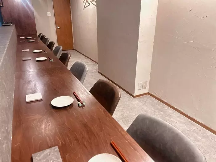 店内はカウンター席のみ。こだわりの食材を目の前で調理し、揚げたての天ぷらを一品ずつ提供しています。優しい灯りに照らされ、BGMにはジャズが流れる空間は、都会の喧騒から離れた静かな隠れ家のような雰囲気です。