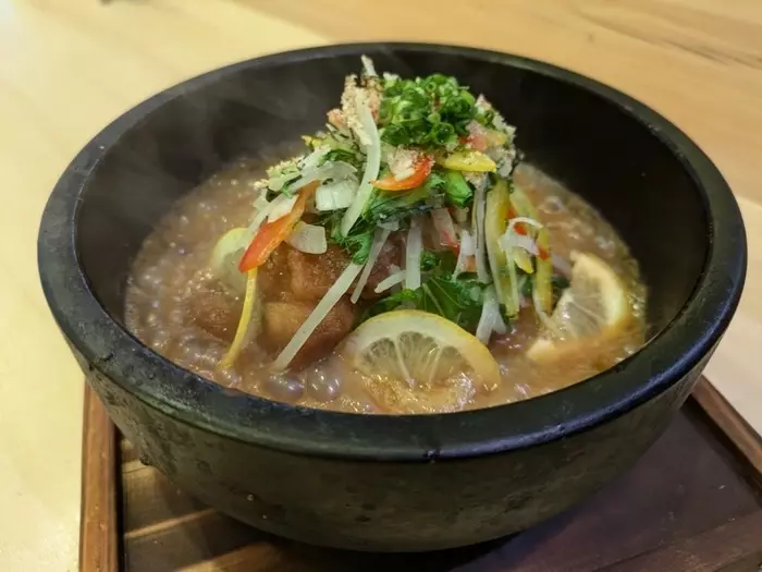 博多長浜鮮魚市場から直接仕入れた旬食材は、揚げもの、焼きもの、刺身など、好みの調理法でオーダー可能。名物『特製鶏の唐揚げ』は、サクッと揚げた鶏唐揚げを熱々の石焼き鍋で提供。時間経過とともにたれが絡んだ食材の変化する味わいが楽しめます。予算や好みに合わせてコース料理も提案。