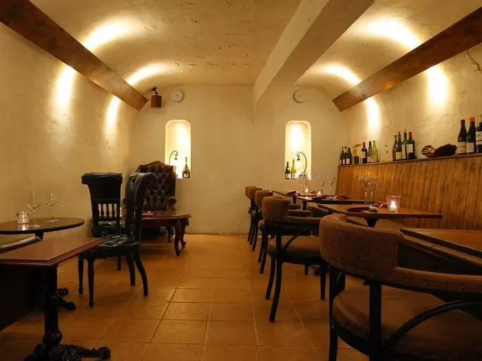 神楽坂駅よりすぐ、熟練フレンチシェフによる料理と個性豊かなワインを楽しめる一軒。駅を出てすぐ横の扉を開いて下りた先に広がるのは非日常的な空間。フランス人大工が手掛けた内装は、現地のワインカーブにワープしたような佇まいです。カウンター、テーブル席、ローテーブル席があります。