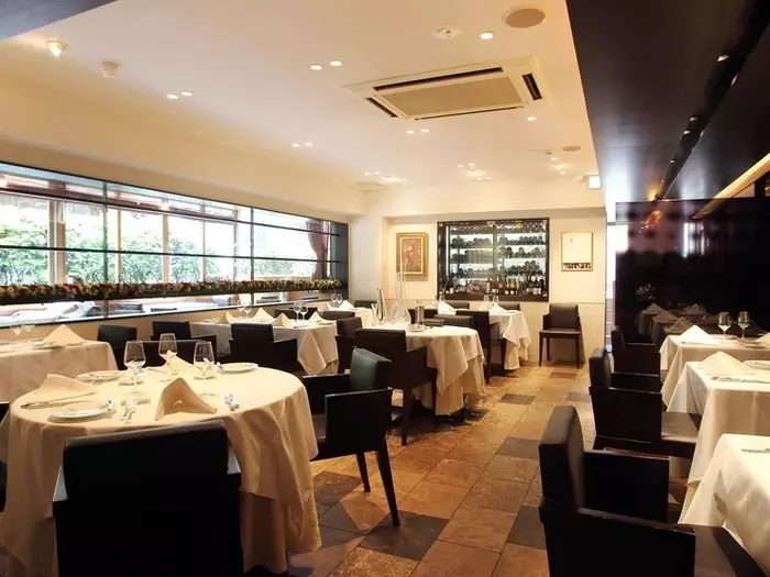 東京・恵比寿の路地裏にある有名な隠れ家フレンチ【レストランモナリザ恵比寿店】。パリの【ギー・サボワ】、スイスの【ジラルデ】ほかで修業を積み、ジョエル・ロブション氏に師事した経歴を持つ、河野透シェフが1997年に独立して開いたお店です。テーブル席のほか、自然光が差し込むテラス席も人気。