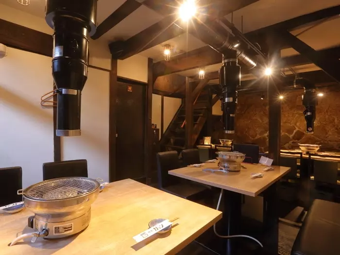 お店は古民家をリノベーション。町家の風情を残しつつ、モダンで洗練されたデザインで仕上げています。地下1階には長らく家を支え続けてきた石垣の壁が残り、建物の歴史を語っています。1階のカウンター席やテーブル席も居心地のよい空間です。スタイリッシュな古民家で焼肉を味わう、特別感を楽しみましょう。