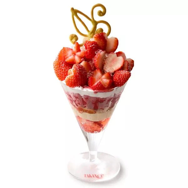 ふんだんに苺がのった、苺が主役のパフェ。生果の苺を頬張った先にも苺とりんごのグラニテや苺のゼリーが詰まっています。間にはほろ苦さとまろやかさが重なり合うカラメルマスカルポーネクリームが苺を引き立て、最後まで苺そのもののおいしさを感じられる大満足のパフェです。