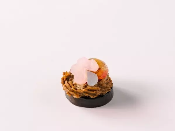 とろけるリエットと桜の花びらを入れたコンソメジュレのハーモニー。よく見ると花びらの1枚がブルーになっており、ここにも「SAKURA Collection」の夜桜を思わせるシェフパティシエの遊び心がちらり