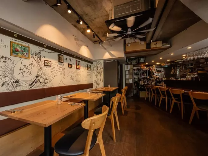 木のぬくもりに包まれた店内。カウンター席のほか、ゆったり食事ができるテーブル席も用意。優雅で贅沢な時間が過ごせます。料理とのペアリングを楽しめる自然派ワインは250本~300本ほど。同じボトルは2本以上ないという豊富なラインアップが魅力です。彩り豊かな料理とワインを味わえば、二人の会話も弾みます。