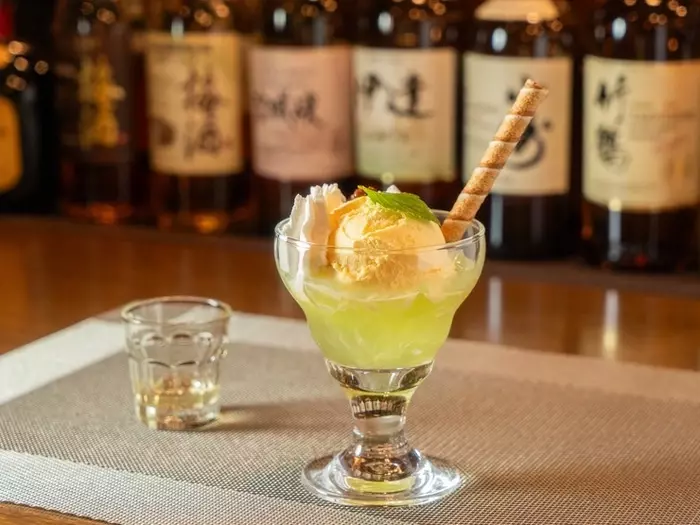 60分飲み放題で楽しむのが、こちらのスタイル。カウンターには『白州』や『山崎』をはじめトップブランドのウィスキーがズラリ。飲み比べて、自分好みの味を見つけるのも楽しみ方の一つです。シメにオススメの『オリジナル白州パフェ』は、白州入りゼリーと白州漬けレーズンが入ったオリジナルパフェ。最後に白州をかけていただきます。