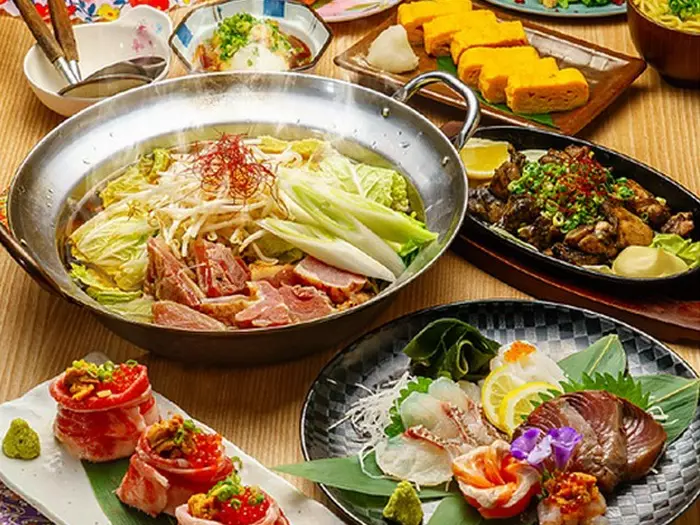 鮮度にこだわる食材を贅沢に使用した料理がいただけます。旬の食材を堪能できる『鮮魚盛り合わせ×薩摩極みの鶏のコース』は宴会で大人気。鍋料理や寿司なども選択可能です。鹿児島を代表する地鶏、旨みたっぷりの『さつま地鶏』は、適度な歯ごたえと甘さを感じる独特な味わい。鮮度抜群なので、刺しでも楽しめます。