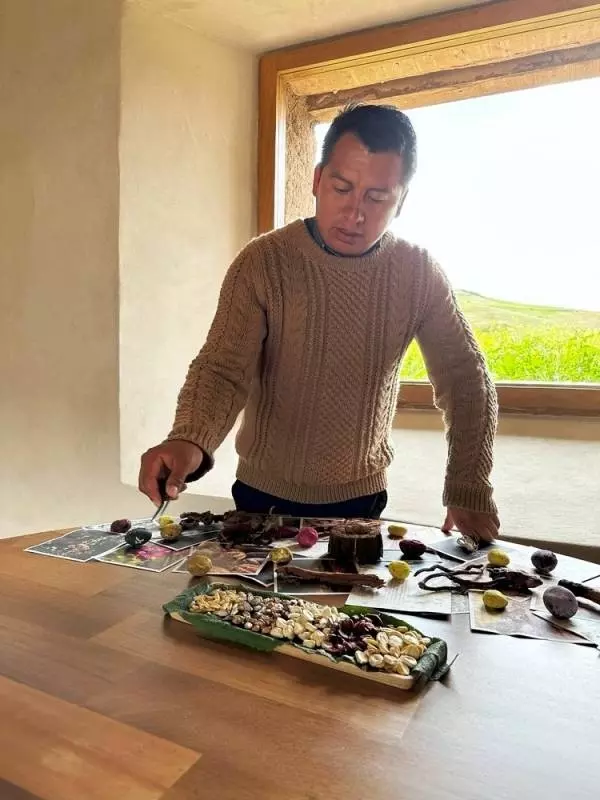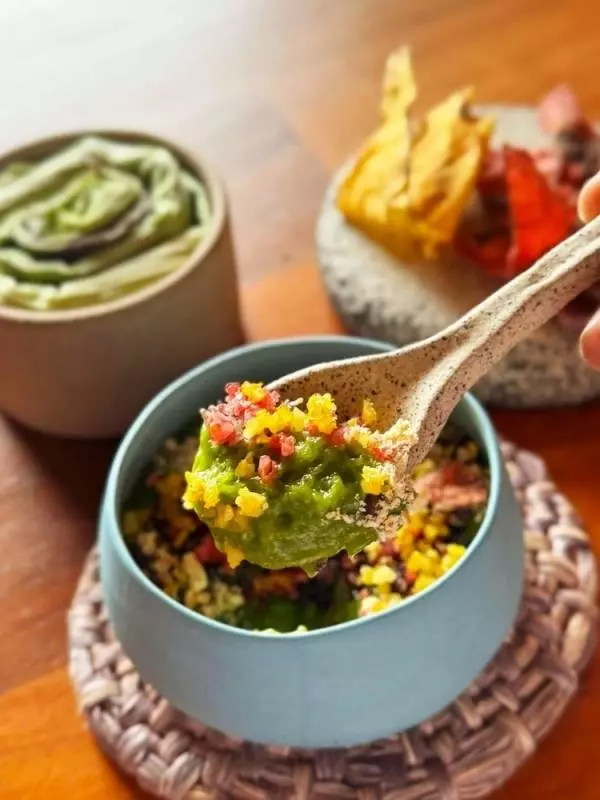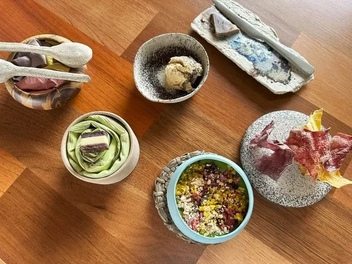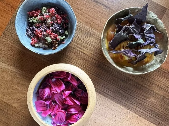アルパカの肉です。アルパカは何度か食べたことがありますが、こういうのは初めて。14時間低温調理した肉がマルバという花の下に隠れていて、混ぜていただきます。クセがなく温かく優しい味わいに花が香りを添えます。ほっとする味。キヌアはアイラという花で色付けされて山羊のチーズといただきます。この色合い食感も面白い。アンデスのスーパーフードであるキウィチャの葉はトマト、タマリンド、卵黄のソースでいただきます。