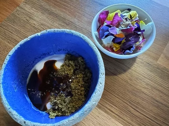 雪山に見立てたグラデーションの美しいアイスに、3種類のヤーコン芋やキヌアのヨーグルトが花に包まれて出されます。
