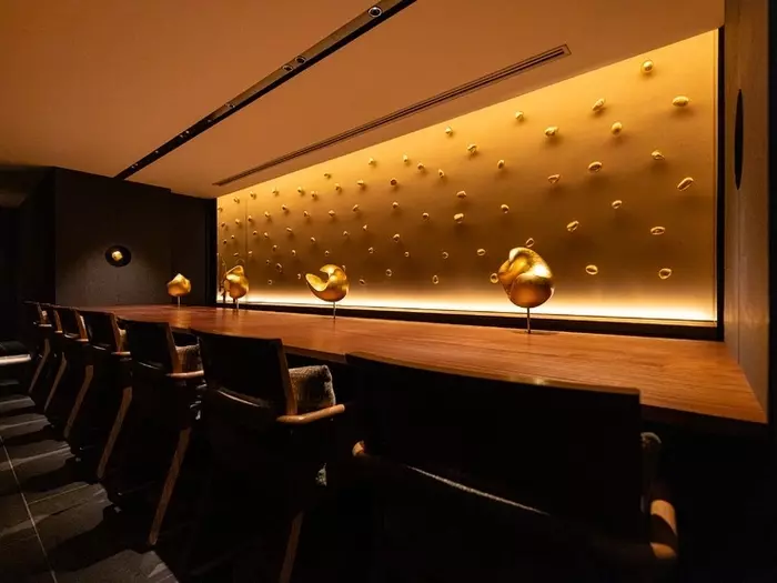入口のホログラムの扉を開けると、想像を超える空間が広がっています。ゴールドが印象的な内装は、まるで映画のワンシーンのような雰囲気です。店内の壁面には職人が金箔を施した石が無数に配置され、別世界に迷い込んだのかのよう。カウンター席とプライベートが守られる個室もあり、美食の記憶とともに忘れられない時間が過ごせます。