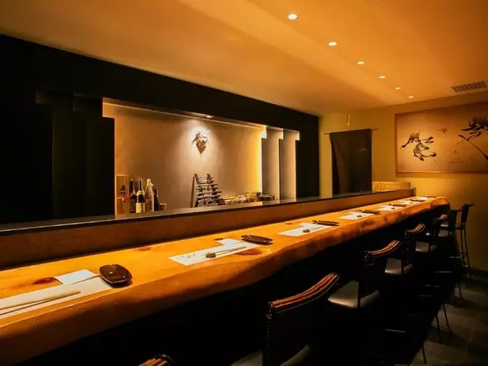看板もなく、ひっそりとした隠れ家のような寿司店。特徴的な長い入口の先には、カウンター席が7席のみの洗練された空間が広がります。厳選素材を使用した高級感のある寿司店ながら、手が届きやすい価格設定なのもうれしいポイント。全国から厳選した希少な日本酒も取りそろえられています。上質な空間で、特別な時間が過ごせる一軒です。