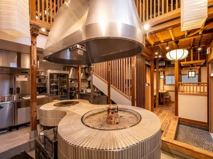 炭火焼きの香ばしい香りに包まれている店内。古民家をリノベーションした趣ある空間には、大小のテーブル席が用意されています。ユニークなひょうたん形の囲炉裏を中心とした吹き抜けの設計なので、周囲から調理風景を見ることもできます。ドリンク類も豊富にそろっていて、季節の日本酒や、手作業で漬け込んだ爽やかなサワーなども楽しめます。
