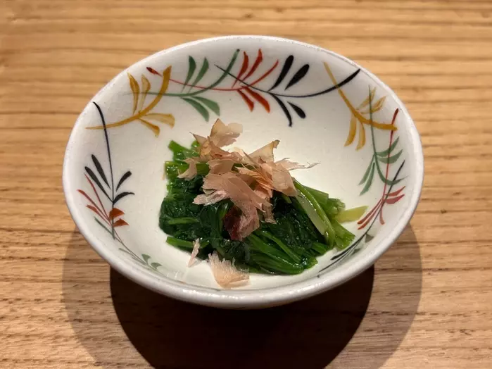 春の新メニューということで、一皿目は『せりのおひたし』から。春を感じる爽やかな香りと、ほんのりとした苦みが特徴です。