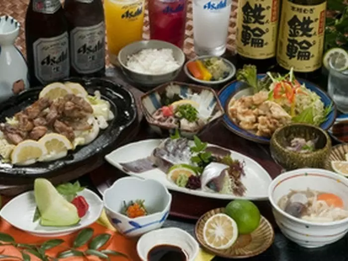 まずは関サバ・関アジをはじめ大分が誇る朝獲れ鮮魚をお造りで。大分に初めて来た方も、なぜか懐かしいホッとする味の名物だんご汁もぜひ味わいたいメニューです。焼酎にもこだわりがあり、ラインナップは約100種類。全9品飲み放題付き5,000円・6,000円のコースも人気です。