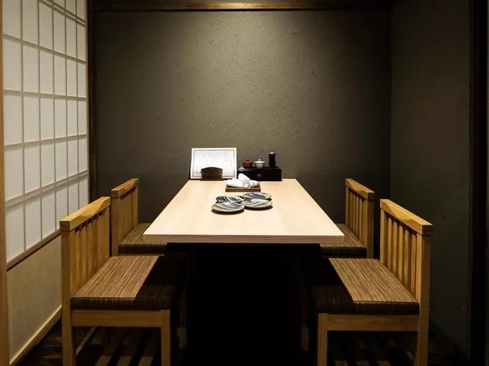 お店は京都駅近くの細い路地に佇んでいます。駅すぐの立地ながら、ひっそりとしていて隠れ家のよう。1Fと2Fがあり、1Fは囲炉裏で食材が焼かれる様子を間近に見られるライブ感が楽しめます。カウンター席やテーブル席のほか、2名から30名まで対応可能な個室も完備。最大50名までの大人数でも相談可能なのがうれしいところです。