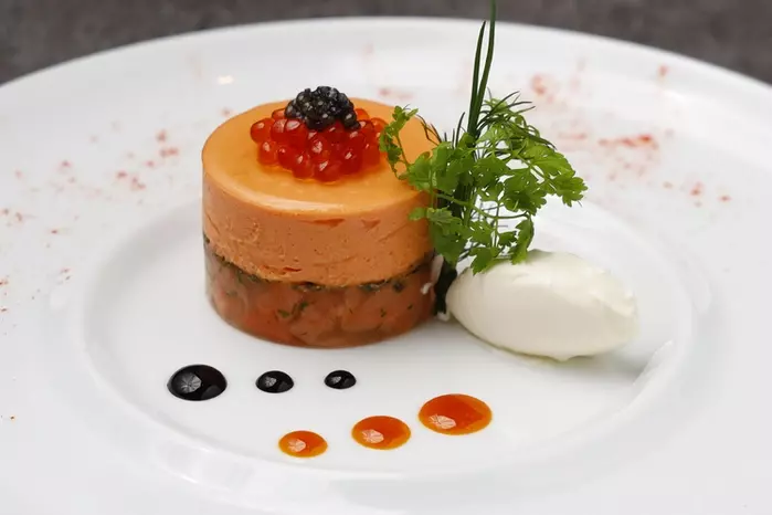 『モークサーモンのパルフェ イクラとキャビア』。パルフェ=フランス語でパーフェクトの意味。スモークサーモンのムースとゼリーを二層仕立てにし、イクラとキャビアで豪快に仕立てた一皿です