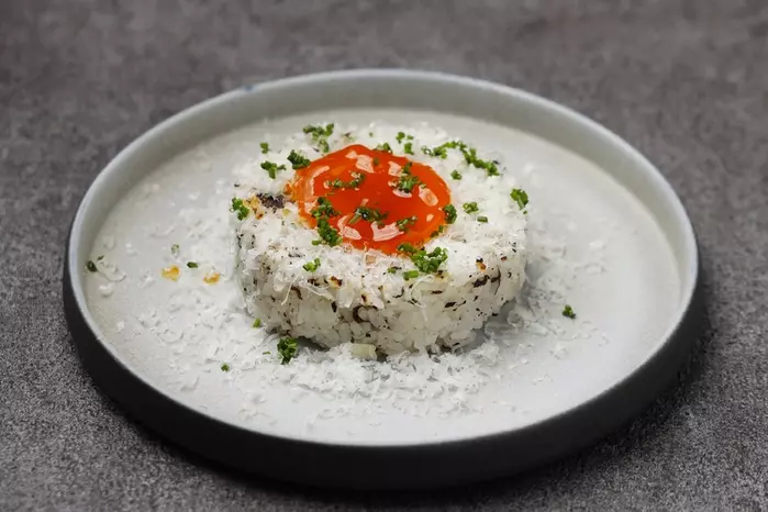 『トリュフとチーズの焼きおにぎり ~卵黄醤油漬け~』。贅沢にトリュフを混ぜたおにぎりを炭火でじっくり焼き上げています。卵黄のしょうゆ漬けとチーズとともに楽しみます