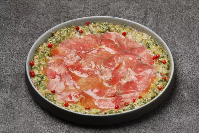 『牛タンのカルパッチョ ~ラビゴットソース~』。低温調理した牛タンをカルパッチョ風にした一品です。まるで生で食べているような食感で、さわやかな酸味のラビゴットソースとともにいただきます
