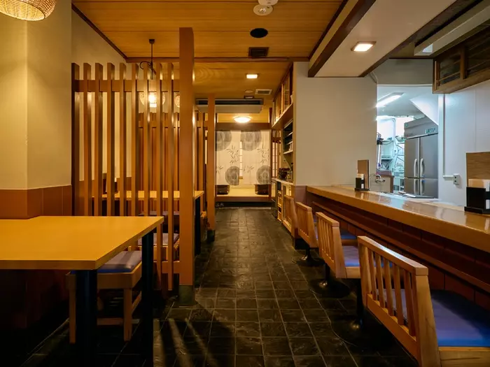 和の趣が漂う店内は、しっとりと落ち着いた雰囲気。テーブル席の間には格子状の仕切りがあるので、周りに気兼ねせずに過ごせます。お一人様ならカウンター席で、スタッフと会話を楽しむのも良いですね。飾られた絵がジグソーパズルだったり、あちこちに小物が隠れていたり、楽しい仕掛けが随所に潜んでいるので、料理を待つ時間も楽しめます。