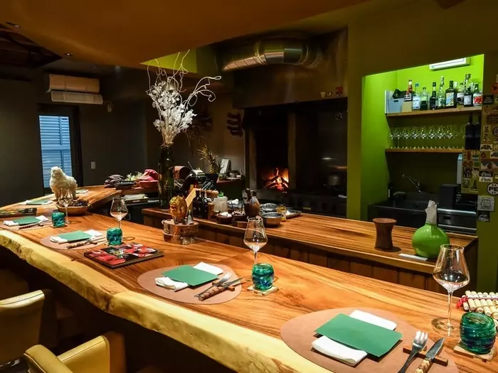 一枚板のカウンターと、南米らしいポップな色使いが印象的