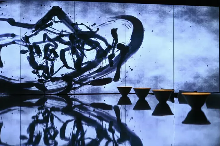 【Vegan Ramen UZU Kyoto】は、2020年に京都の御所南にオープンしたヴィーガン専門店。アートコレクティブ・チームラボのアート作品《反転無分別 - Black in White》が壁に展示され、作品を取り囲むように黒く磨かれたテーブルを配置。客人は、壁だけでなく、テーブルにも映り込んだ作品に包まれながら、ヴィーガン料理を食べることができます。