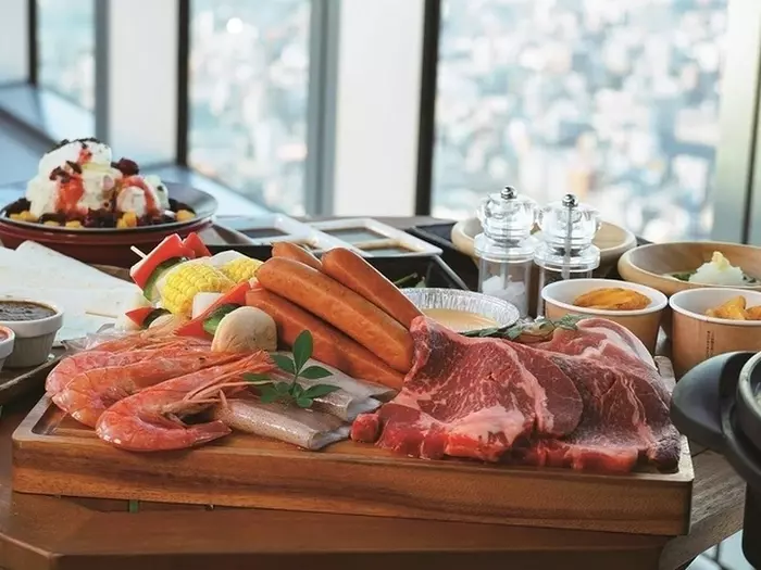 展望台の高さ300mにちなんだ、長さ300mmのハワイアンホットドッグ『プカドッグ』や、ユニークな『パインアメソフトクリーム』など、遊び心あふれるオリジナルメニューが人気です。夏季には屋上庭園でBBQ、冬季にはこたつで温まりながら鍋やおでんを楽しめる期間限定コースも楽しめます。