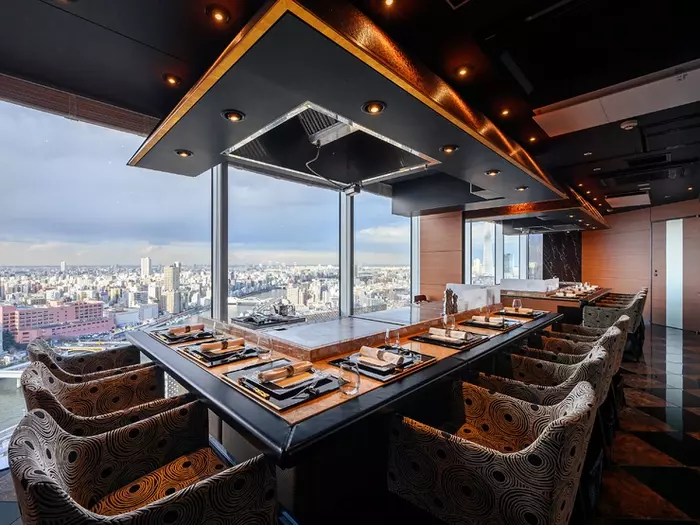 お店があるのは、「アパホテル&リゾート両国駅タワー」31F。大きな窓からは、隅田川の流れや東京の街並みなどが一望のもと。最上階ならではの圧倒的な眺めが楽しめます。きらめく夜景はムーディーで、大人のデートにぴったりです。料理人が目の前で鉄板焼きの技を披露するカウンター席は、音や香りなど、五感で鉄板焼きが満喫できます。