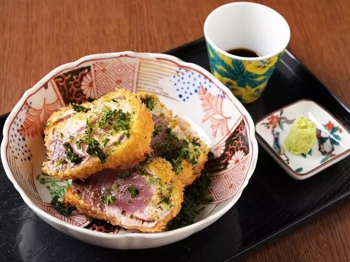 金沢駅から徒歩15分の【ひかりや&yajimon】は、近江町市場から仕入れた新鮮な魚介を中心に多彩なメニューが楽しめる居酒屋。『レアぶりカツ』は、絶妙な温度加減でレアな箇所を残したまま、さっくりと仕上げた自慢の一品。