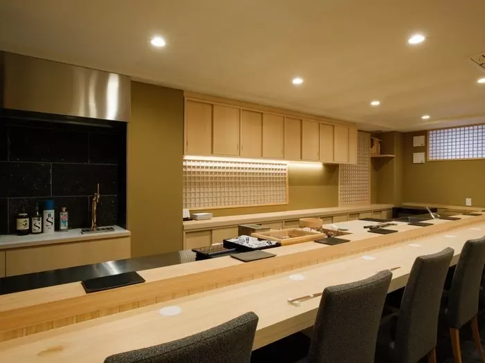 店内は、凛とした空気に包まれる落ち着きのある空間。温かみのあるカウンター席からは、巧みな鮨職人の技を見ることができます。日本酒は、地元石川県を中心に、料理の味わいを引き立てる銘柄を常時10種類以上ラインナップ。また鮨とともに楽しむためのワインも豊富に取り揃えられています。大切な人と訪れてみたい一軒です。