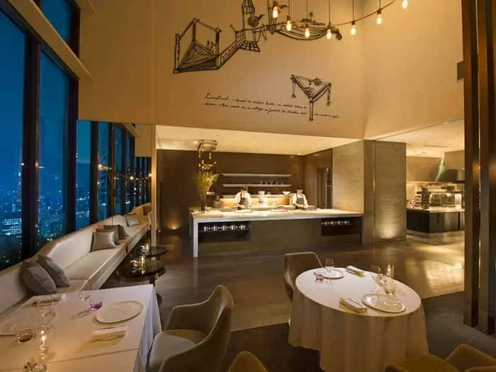 汐留駅より徒歩1分、東京屈指の絶景を誇るホテル「コンラッド東京」28階のフレンチ。昼は高層ビルなど都会の建造物が織りなす景観を望めます。照明や壁面の装飾、什器に至るまでコンテンポラリーアートのように斬新なアイテムを揃えた天井の高い店内は、さながら現代アートギャラリーのよう。