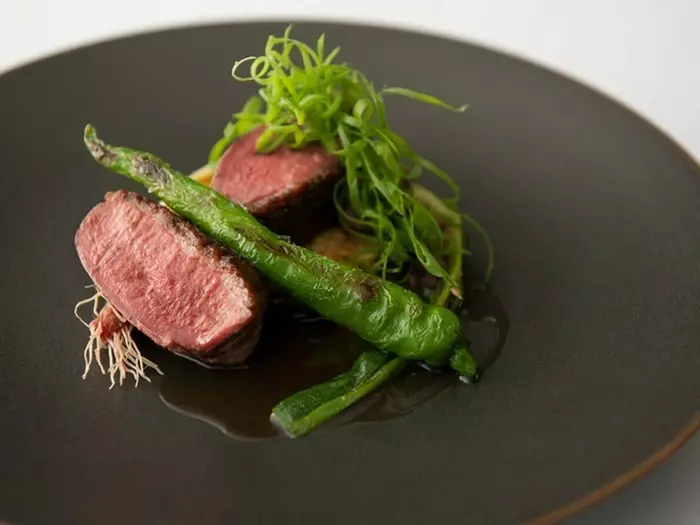 焼き茄子に鴨肉と伏見唐辛子と九条葱をのせた『鴨のロースト 賀茂茄子と焼き葱 ソバの実』