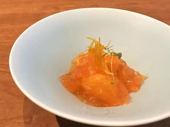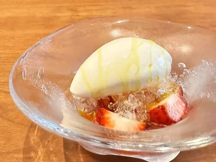 食事のあとのドルチェは2品。紅八朔と苺です。紅八朔でさっぱりして、苺の優しい甘さで締めます。