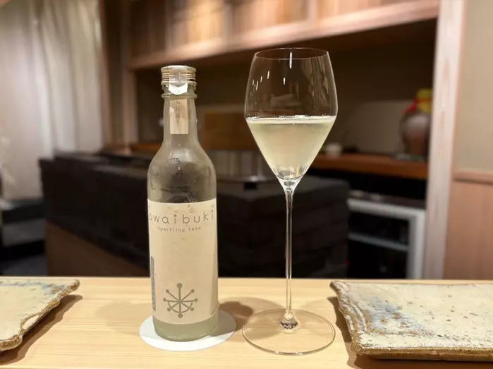 米の甘みがほんのりと漂うスパークリング日本酒「七本槍awaibuki」。爽やかな泡とともに、コースへの期待感を高めてくれます
