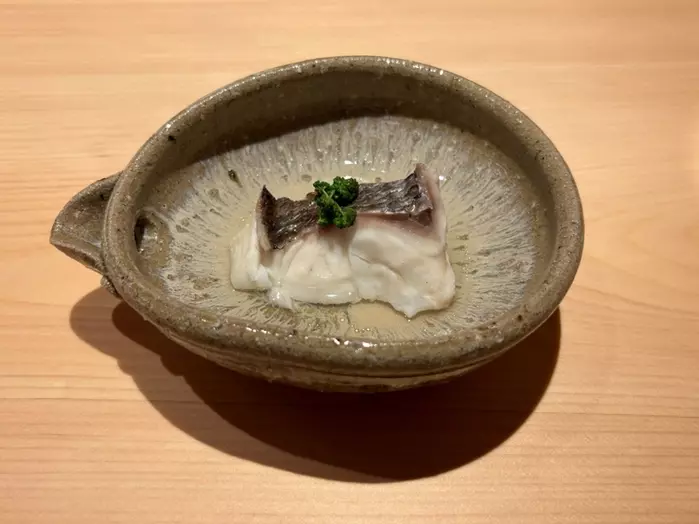 1皿目:神経締めの『真鯛』。ふっくらとした身に、岡山産の花山椒が香りを添え、透明感あるあさりのだしとともに味わう一品