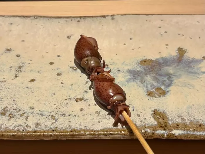 2皿目:串打ちされた『ホタルイカ』。肝のクリアな旨みが際立ち、ここでも日本酒がよく進みます