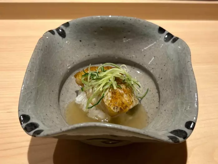 5皿目:趣向を凝らした焼き寿司『のどぐろの焼き寿司』。ほのかな酸味をまとった酢飯と、餡かけに仕立てたのどぐろの濃厚な旨み。上には、収穫の際に1回しか触れないという「ワンタッチきゅうり」を添えて
