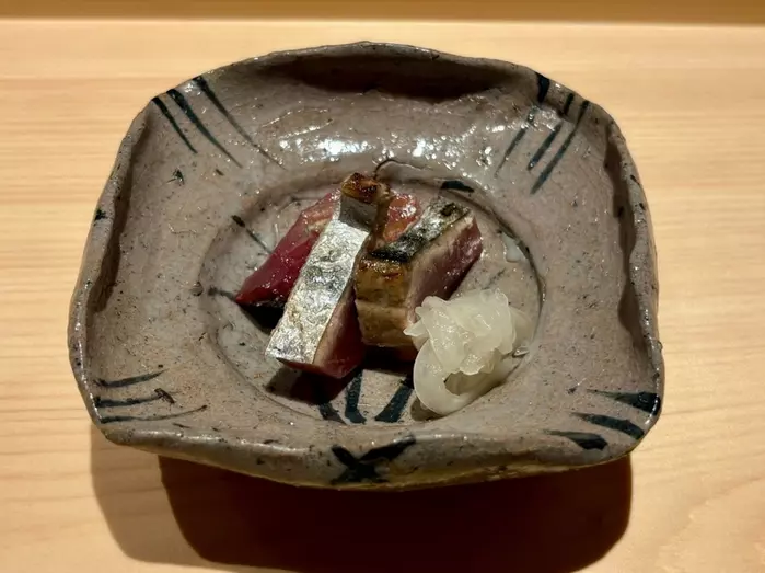 4皿目:炭火で炙られた『初鰹』。脂がのっていて、厚みもあるので歯ごたえもしっかり。横に添えられているのはお口直しの新玉ねぎの酢漬け