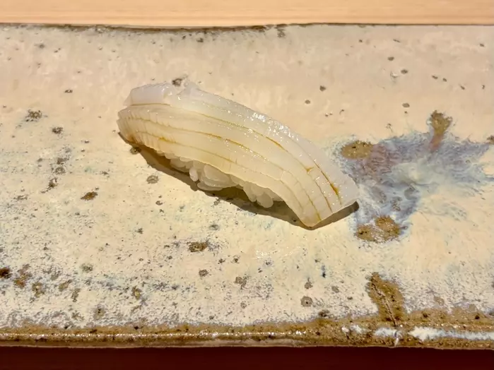 1貫目:「さかな人」長谷川大樹さんから届く、神経締めの『アオリイカ』。口に入れた瞬間にとろける、繊細な仕立て