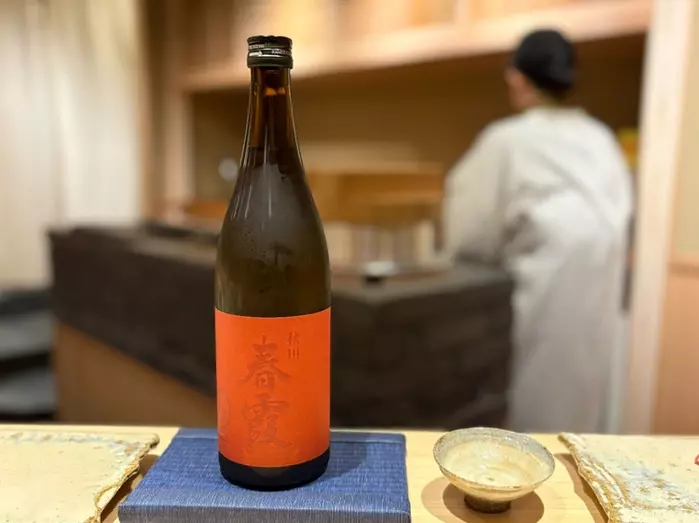「春霞 純米酒 花ラベル」は羽釡を使って蒸し燗に。フレッシュな旨みがいっそうふくらみ、鮪の脂がよりまろやかに感じられる