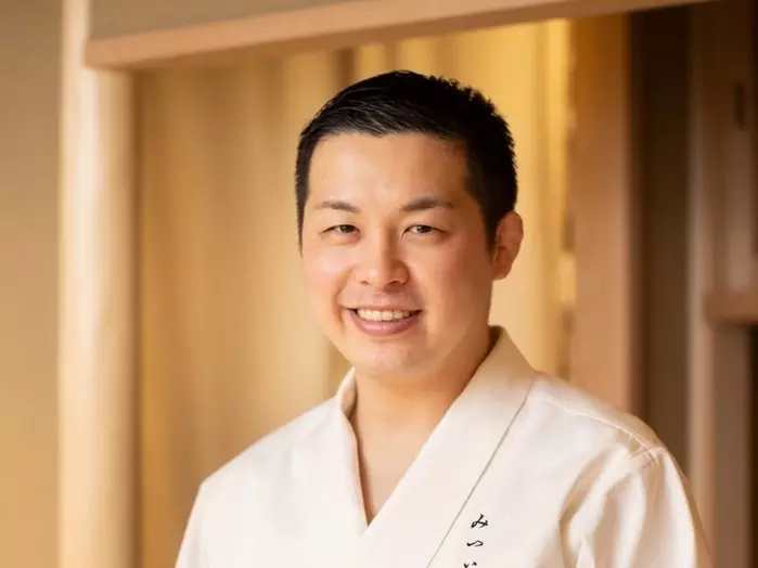 三井 祥(みつい しょう)。1988年、長野県生まれ。武蔵野調理師専門学校を卒業後、新宿のホテル「ヒルトン東京」の日本料理店で料理人としての基礎を体得。三つ星店 銀座【青空】の高橋青空氏の鮨に惚れ、門戸を叩く。8 年半の修業後、西麻布【鮨祥】の付け場を務め上げ、2025 年5月、麻布十番に【みつい】を開店。