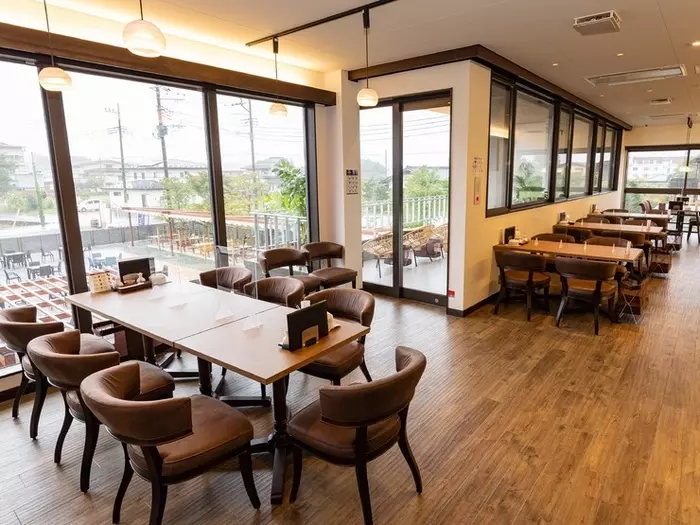 河口湖畔と富士山を望むカフェスペース