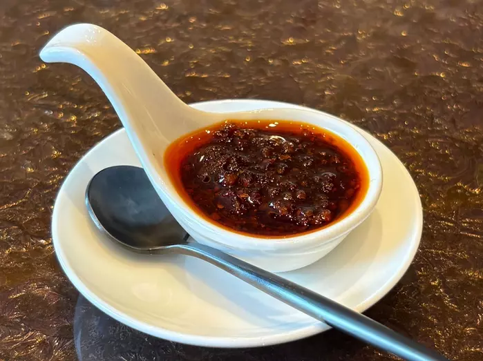鹿児島県産の黒豚と高知県産の茄子を使用した汁なし麺。麺は自家製の香港麺を使用。まずはそのままいただき、味変で山椒入りのラー油をかけます。海老醤のような味わいで、辛さもちょうどいい。