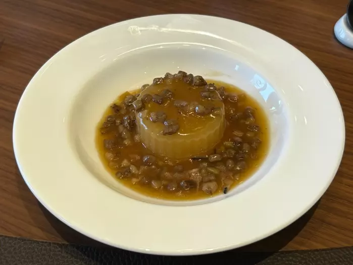 日本人にとってなじみ深い大根をメインに据えた一皿。和牛のひき肉には松阪牛を使用。大根がメインというのは日本人にとってなんとも珍しい印象を受けますが、それくらい日本の大根の食材が素晴らしいという証拠なのでしょう。